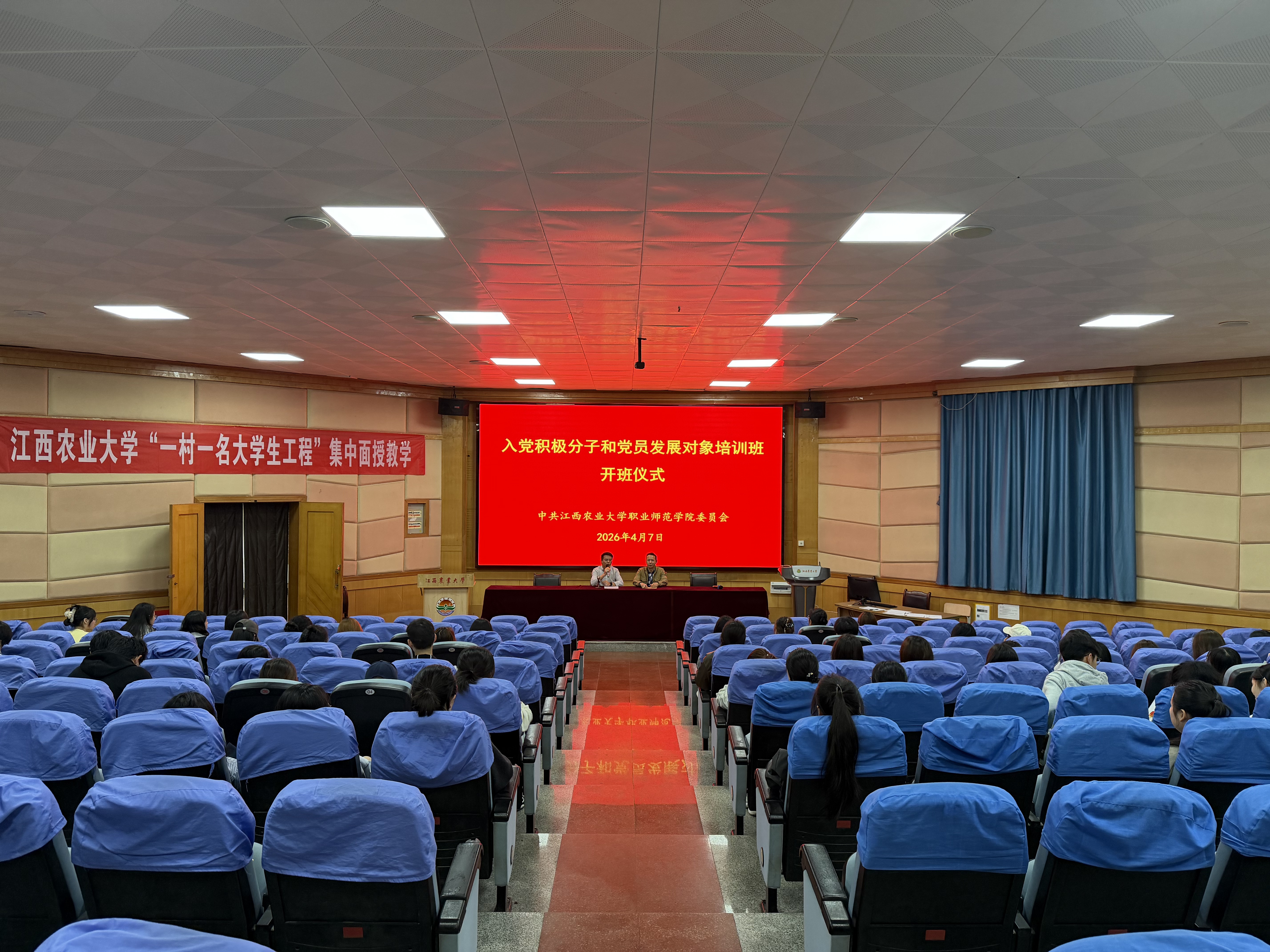 2026年4月7日,江西农业大学职业师范学院党委在院办一楼报告厅举行入党积极分子和党员发展对象培训班开班仪式,仪式由学院党委副书记张利斌同志主持,全体参训学员参加会议。